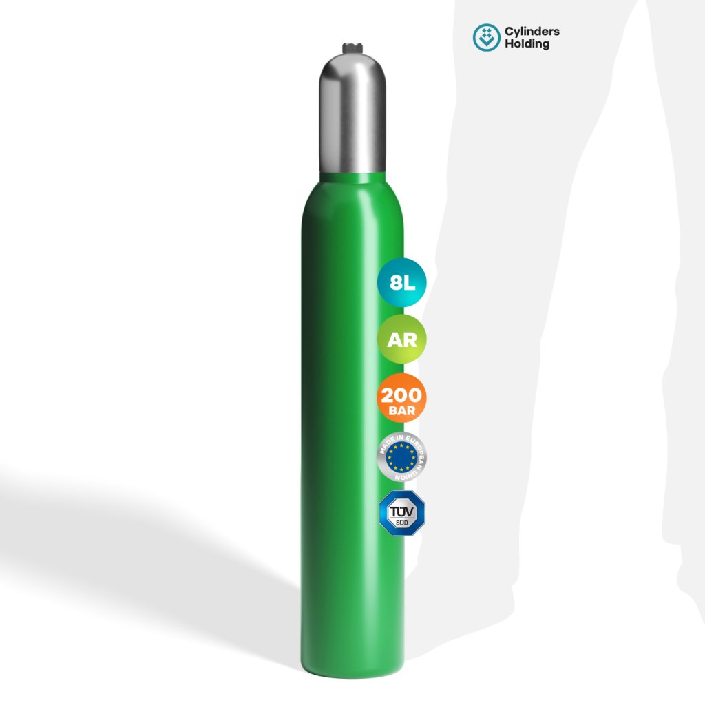 8 liter high-pressure seamless steel cylinder for argon (Ar). The gas cylinder with a working pressure of 200 bar is made of first-class European steel 34CrMo4, equipped with a standard brass valve and a steel cap.